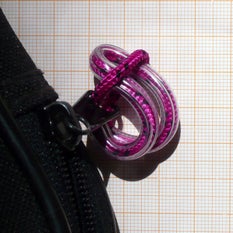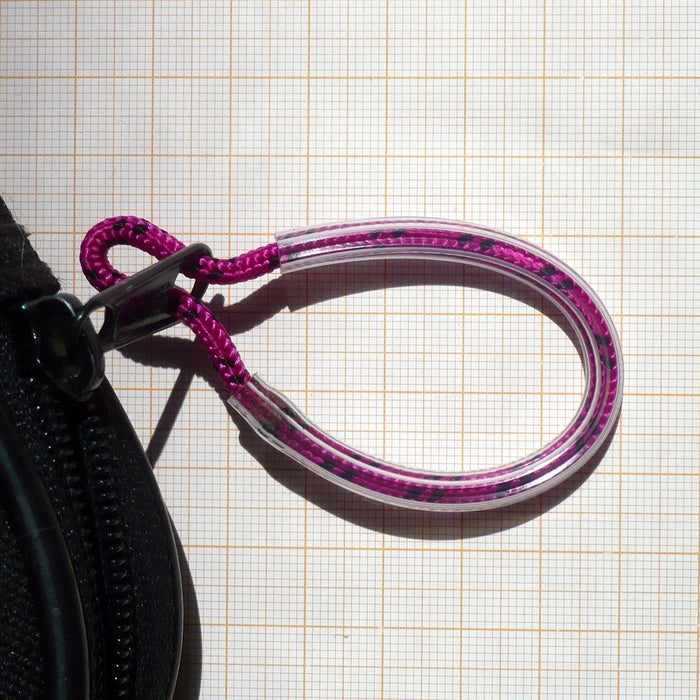 The zipper pull is made of nylon cord with a sleeve of plastic tubing. I used 3mm accessory cord and plastic tubing used for oxygen masks. Any clear (or coloured for that matter) tubing should work. Most aquarium stockist or hardware store should have it. Make sure that the inner diameter of the tubing is close to the diameter of the cord. The fit should be snug but not too tight.