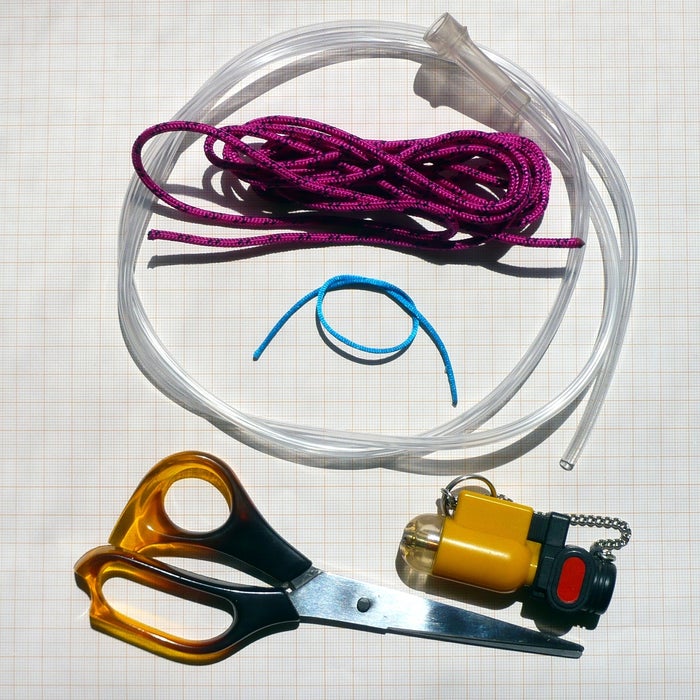 For tools you will need scissors (or a sharp knife), a lighter and a short length of nylon cord that can be pushed through the plastic tubing with ease. It should be longer than the length of tubing you will cut (see later step).